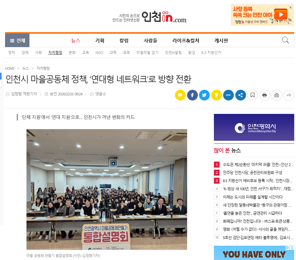 인천시는 “네트워크 활성화는 단기 성과를 내기 위한 사업이 아니라, 마을공동체가 서로 연결되며 성장하는 기반을 만드는 과정”이라며 “주민이 정책의 참여자가 아닌 설계자가 되는 구조를 만들어가겠다”고 밝혔다.