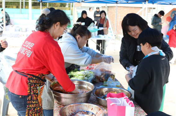 마을 축제 때 텃밭에서 나온 배추와 무로 김장 나눔 행사를