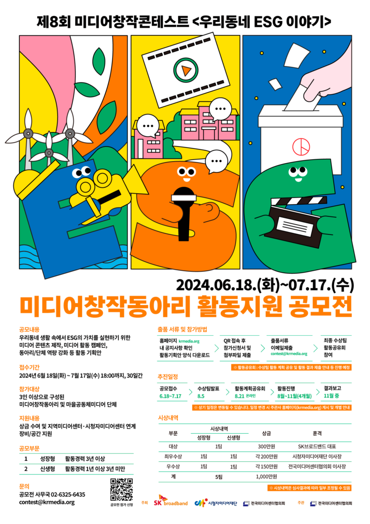 제8회 미디어창작콘테스트 <우리동네 ESG 이야기> 미디어창작동아리 활동지원 공모전을 개최합니다!