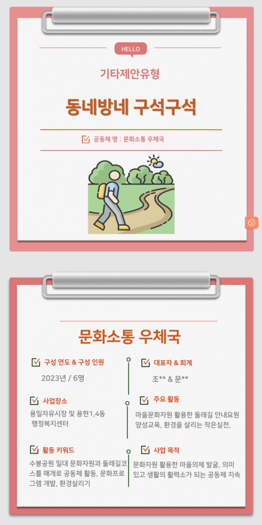마을 공모사업 최종업데이트 : 11/08/2025 조회수 : 75 2025년 기타주민제안 유형 [동네방네 구석구석]작성자 : 관리자 이전글2025년 기타주민제안 유형 [그곳의 이야기, 아카이빙(용일자유시장)] 다음글2025년 마을홍보 유형 [서쪽하늘아래 반짝이는 효성마을] 목록보기