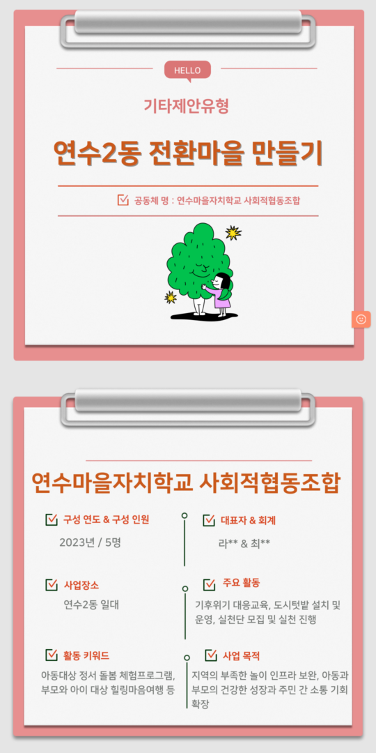 마을 공모사업 최종업데이트 : 11/08/2025 조회수 : 78 2025년 기타주민제안 유형 [연수2동 전환마을 만들기]작성자 : 관리자 이전글2025년 기타주민제안 유형 [ 우리사이, 이웃사이] 다음글2025년 기타주민제안 유형 [ 우리동네 공유장터 되살림] 목록보기