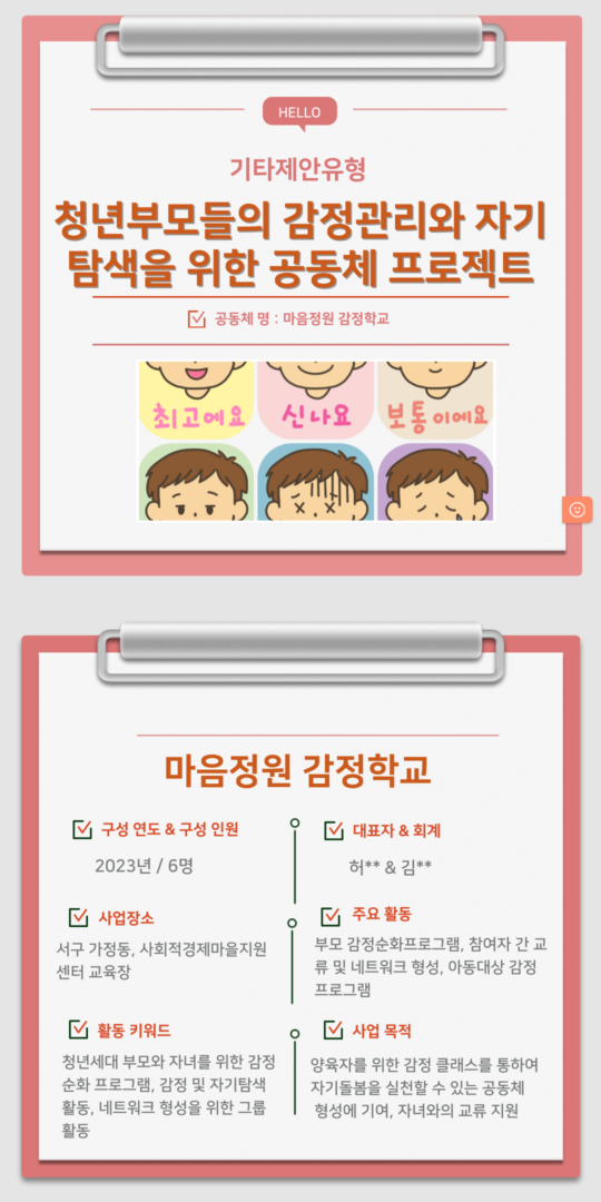 마을 공모사업 최종업데이트 : 11/08/2025 조회수 : 73 2025년 기타주민제안 유형 [청년부모들의 감정관리와 지기탐색을 위한 공동체 프로젝트]작성자 : 관리자 이전글2025년 기타주민제안 유형 [인천, 깊이 알면 사랑한다.] 다음글2025년 기타주민제안 유형 [그곳의 이야기, 아카이빙(용일자유시장)] 목록보기