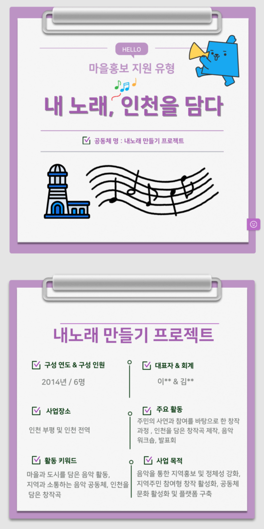 마을 공모사업 최종업데이트 : 11/08/2025 조회수 : 99 2025년 마을홍보 유형 [내 노래, 인천을 담다]작성자 : 관리자 이전글2025년 마을홍보 유형 [서쪽하늘아래 반짝이는 효성마을] 다음글2025년 마을홍보 유형 [화수정원마을MV: 꽃보다 마을] 목록보기