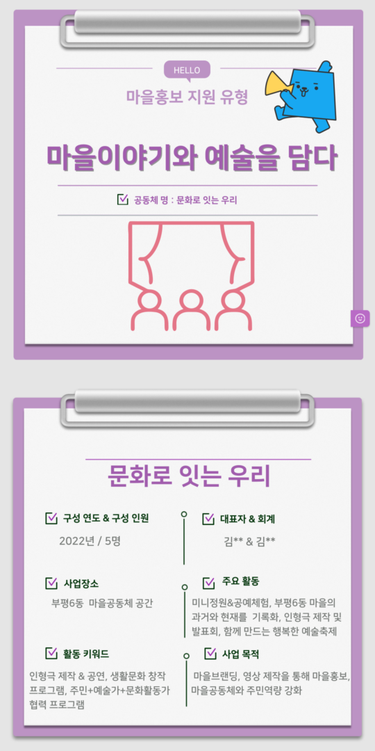 마을 공모사업 최종업데이트 : 11/08/2025 조회수 : 156 2025년 마을홍보 유형 [마을 이야기와 예술을 담다]작성자 : 관리자 이전글2025년 마을홍보 유형 [일신동지명 79주년!! 지역거리축제] 다음글[서구] 피플엠(음악하는 사람들) 목록보기