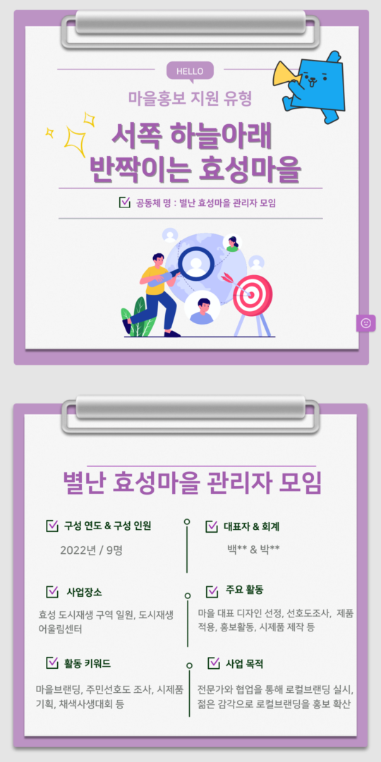 마을 공모사업 최종업데이트 : 11/08/2025 조회수 : 109 2025년 마을홍보 유형 [서쪽하늘아래 반짝이는 효성마을]작성자 : 관리자 이전글2025년 기타주민제안 유형 [동네방네 구석구석] 다음글2025년 마을홍보 유형 [내 노래, 인천을 담다] 목록보기